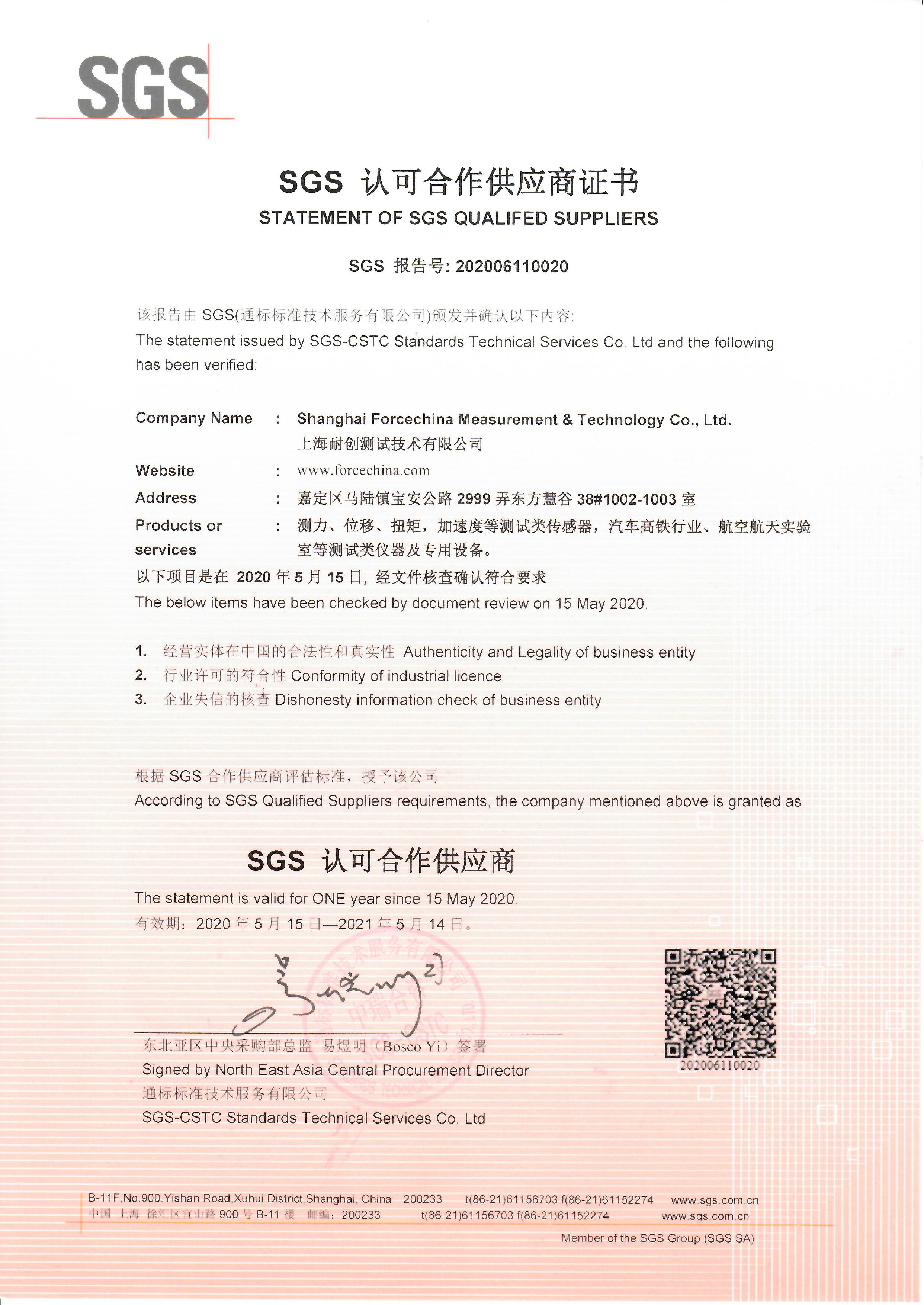 SGS認可合作供應商證書