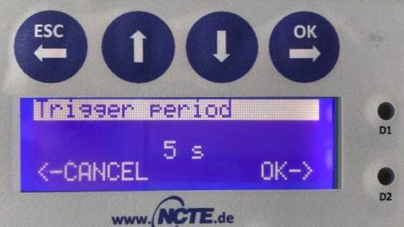 按OK鍵進(jìn)入Trigger period里面,按上下鍵設(shè)置時(shí)間為5~10s(可根據(jù)測(cè)試間隔設(shè)定)按OK確認(rèn)